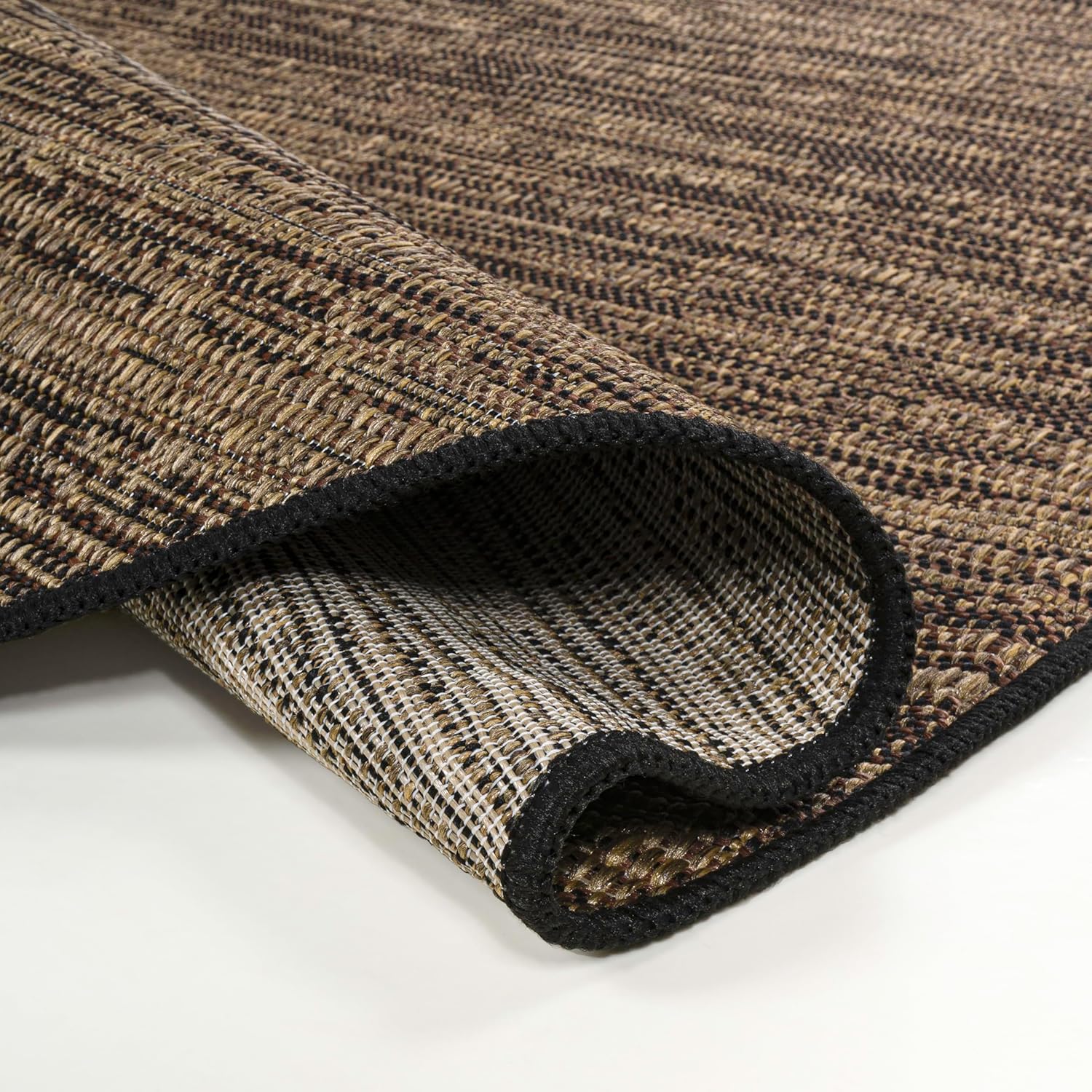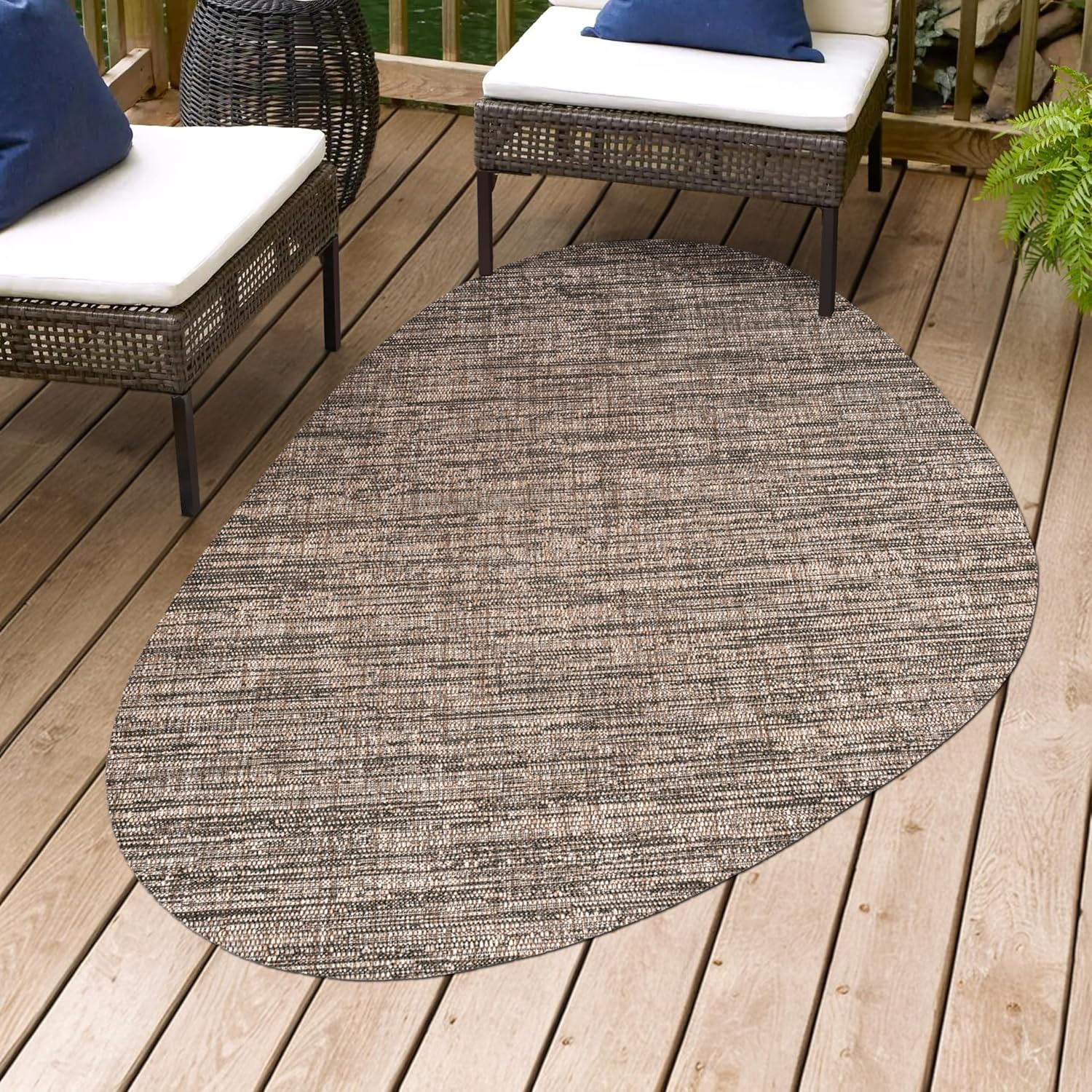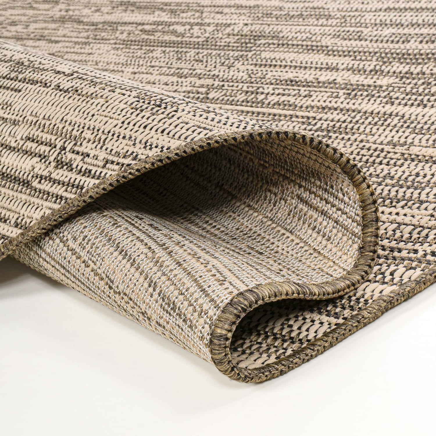 This modern outdoor rug has a minimalist look, with its organic shape and earthy colors. Woven from synthetic fibers, this easy-care rug goes from rustic lodge to urban loft. Use it outdoors on a porch, or in the living room, entry, bedroom or dining room.